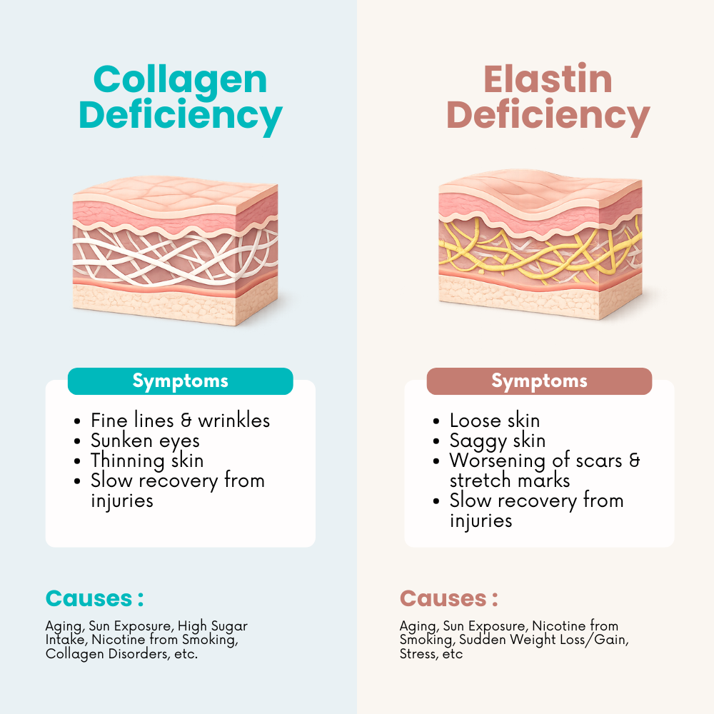Generally, collagen and elastin form the basic foundation of a youthful skin. Collagen provides the support and firmness needed, while elastin provides resilience and flexibility. When both proteins are at sufficient levels, the skin appears smooth, plump, and lifted. However, if either one of them is depleted, your skin’s regeneration process loses its rhythm. Hence, you will notice fine lines, wrinkles, lost elasticity, and other signs of aging skin.