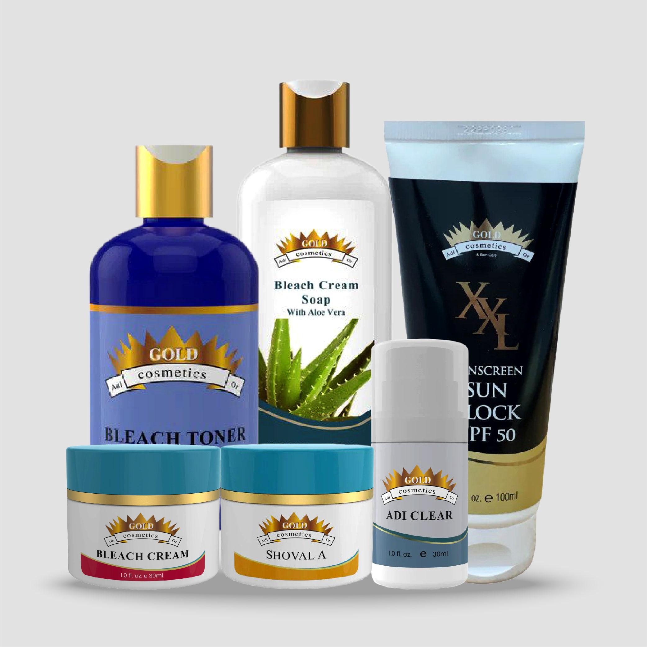 Introducing our number #1 ultimate treatment kit for melasma. This kit contains bleach cream soap, Adi Clear Forte, Shoval A Forte, Bleach Toner, and Sunblock SPF50.